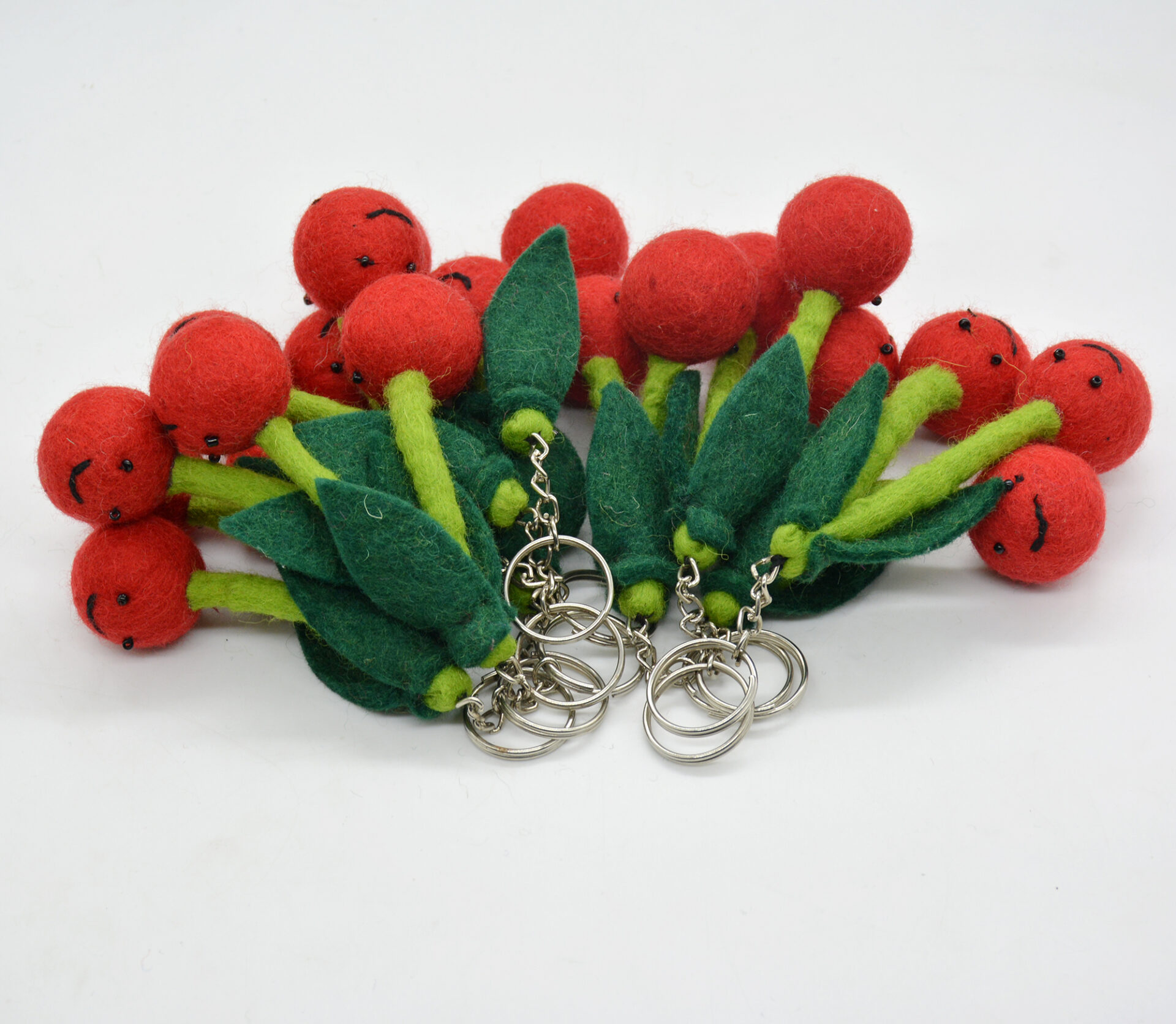 🎨 Colors: Vibrant red cherries with green felt leaves