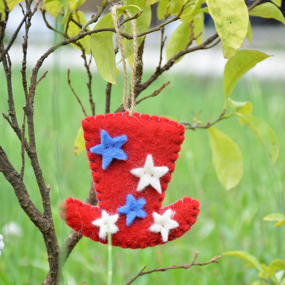 Add a patriotic touch to your décor with our Wool Felt Uncle Sam Hat Ornament, meticulously handcrafted to capture the essence of American tradition. Made from premium quality wool, each ornament is carefully felted to ensure durability and charm. The classic red, white, and blue design brings a festive and spirited feel, making it perfect for Independence Day, Memorial Day, or year-round Americana décor. Available in a small size, it is ideal for hanging on trees, garlands, or gift wrapping. Celebrate with style and craftsmanship by adding this unique felt Uncle Sam hat ornament to your collection.